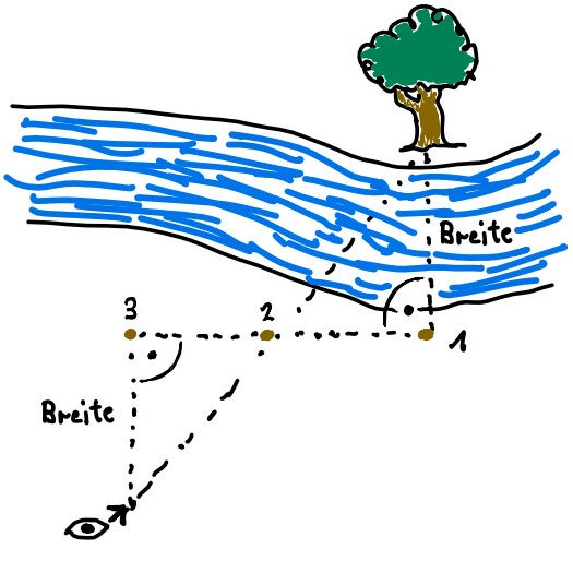Eine Gruppe Pfadfinder steht am Ufer der Blau* und blickt neugierig zum anderen Ufer hinüber. Anna hat ihnen die Frage gestellt. Nun schaut sie fragend in die Runde: „Wie findet ihr das heraus?“ Aus der Gruppe kommt ein Vorschlag: „Wir knoten unsere Handtampen** aneinander, dann haben wir ein Maßband. Meiner hat sogar eine Metermarkierung!“ Anna grinst: „Okay, wer schwimmt rüber?“ Niels erwidert: „Du spinnst wohl! Das Wasser ist ja noch eiskalt. Schwimm doch selbst.“ Anna lächelt und sagt: „So kann man das auch ohne nass zu werden herausfinden …“ und erklärt den Jungs: „Ihr sucht euch eine markante Stelle am gegenüberliegenden Ufer – wir nehmen den Baum dort drüben! Dann steckt ihr einen Stock hier direkt gegenüber am Ufer in den Boden. Jetzt geht ihr ein paar Schritte am Ufer entlang und steckt einen weiteren Stock in den Boden. Achtet darauf, dass der Winkel zwischen Baum und dem zweiten Stock beim ersten Stock genau 90 Grad beträgt – also eine Viertel Torte. Dann geht ihr noch einmal die gleiche Anzahl Schritte weiter am Ufer entlang und steckt einen dritten Stock in den Boden. Die drei Stöcke liegen auf einer Linie! Nun müsst ihr im rechten Winkel vom Ufer weggehen – also wieder eine Viertel Torte –, bis ihr, wenn ihr über den zweiten Stock peilt, den Baum trefft. Seht ihr? Und jetzt entspricht der Abstand zum dritten Stock genau der Breite der Blau!“